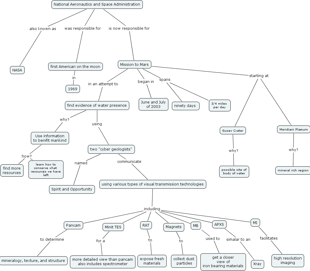 mars rovers paper- antoine bridges, get a closer view of iron bearing materials, spirit and opportunity, 1969, possible site of body of water, expose fresh materials, rat, meridiani planum, learn how to conserve what resources we have left, find evidence of water presence, pancam, mineral rich region, mission to mars, magnets, national aeronautics and space administration, gusev crater, minit tes, two cyber geologists , find more resources, first american on the moon, use information to benifit mankind, collect dust particles, xray, june and july of 2003, mb, nasa, apxs, high resolution imaging, more detailed view than pancam also includes spectrometer, using various types of visual transmission technologies, 3 4 miles per day, mineralogy, texture, and structure, ninety days , mi