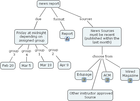 news report, mar 19, news report, edupage, acm, apr 9, feb 20, friday at midnight depending on assigned group, wired magazine, other instructor approved source, mar 5, report, news sources must be recent (published within the last month)