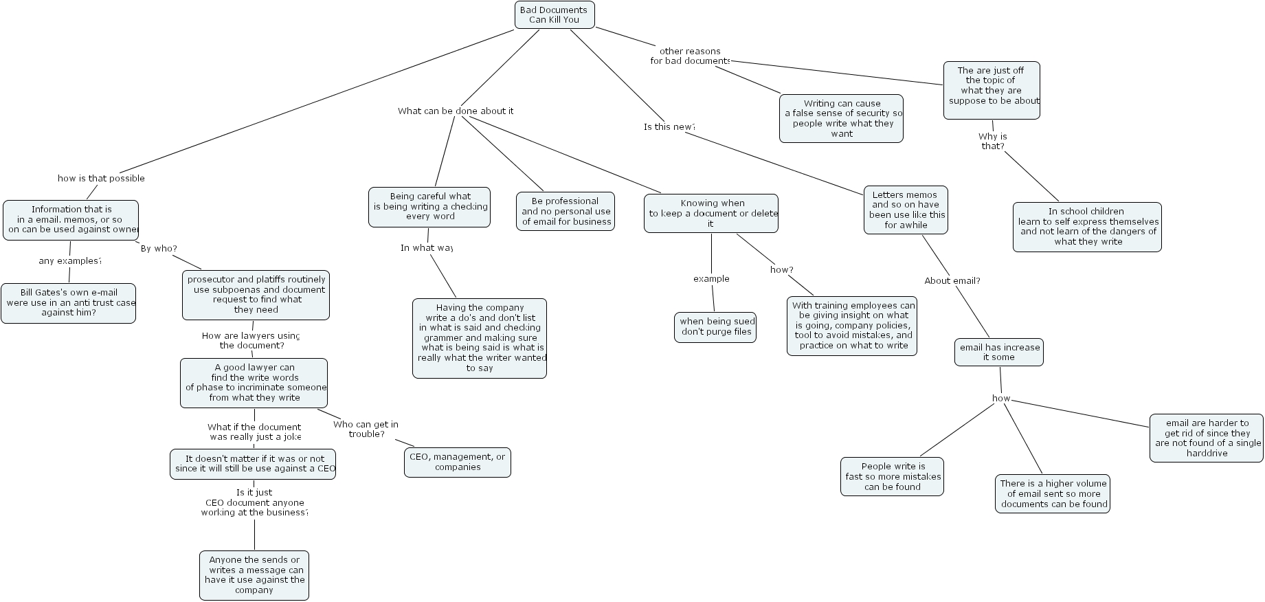 bad document can kill you, prosecutor and platiffs routinely use subpoenas and document request to find what they need, when being sued don't purge files, bill gates's own e-mail were use in an anti trust case against him?, anyone the sends or writes a message can have it use against the company, in school children learn to self express themselves and not learn of the dangers of what they write, with training employees can be giving insight on what is going, company policies, tool to avoid mistakes, and practice on what to write, writing can cause a false sense of security so people write what they want, email are harder to get rid of since they are not found of a single harddrive, information that is in a email. memos, or so on can be used against owner, ceo, management, or companies, letters memos and so on have been use like this for awhile, email has increase it some, it doesn't matter if it was or not since it will still be use against a ceo, bad documents can kill you, knowing when to keep a document or delete it, a good lawyer can find the write words of phase to incriminate someone from what they write, there is a higher volume of email sent so more documents can be found, being careful what is being writing a checking every word, having the company write a do's and don't list in what is said and checking grammer and making sure what is being said is what is really what the writer wanted to say, be professional and no personal use of email for business, people write is fast so more mistakes can be found, the are just off the topic of what they are suppose to be about