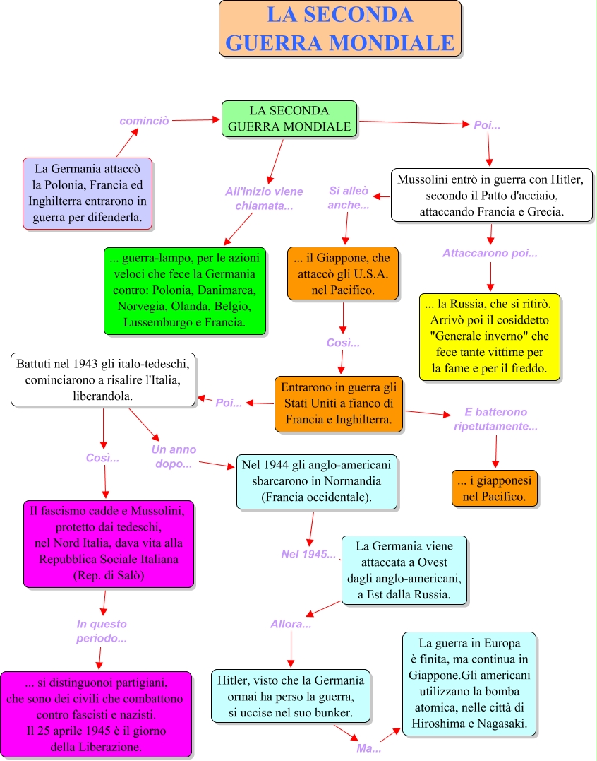 Questa Cmap, creata con IHMC CmapTools, contiene informazioni relative a: seconda guerra mondiale (giovanna), Mussolini entrò in guerra con Hitler, secondo il Patto d'acciaio, attaccando Francia e Grecia. Si alleò anche... ... il Giappone, che attaccò gli U.S.A. nel Pacifico., LA SECONDA GUERRA MONDIALE All'inizio viene chiamata... ... guerra-lampo, per le azioni veloci che fece la Germania contro: Polonia, Danimarca, Norvegia, Olanda, Belgio, Lussemburgo e Francia., Il fascismo cadde e Mussolini, protetto dai tedeschi, nel Nord Italia, dava vita alla Repubblica Sociale Italiana (Rep. di Salò) In questo periodo... ... si distinguonoi partigiani, che sono dei civili che combattono contro fascisti e nazisti. Il 25 aprile 1945 è il giorno della Liberazione., Battuti nel 1943 gli italo-tedeschi, cominciarono a risalire l'Italia, liberandola. Così... Il fascismo cadde e Mussolini, protetto dai tedeschi, nel Nord Italia, dava vita alla Repubblica Sociale Italiana (Rep. di Salò), La Germania attaccò la Polonia, Francia ed Inghilterra entrarono in guerra per difenderla. cominciò LA SECONDA GUERRA MONDIALE, La Germania viene attaccata a Ovest dagli anglo-americani, a Est dalla Russia. Allora... Hitler, visto che la Germania ormai ha perso la guerra, si uccise nel suo bunker., Hitler, visto che la Germania ormai ha perso la guerra, si uccise nel suo bunker. Ma... La guerra in Europa è finita, ma continua in Giappone.Gli americani utilizzano la bomba atomica, nelle città di Hiroshima e Nagasaki., Entrarono in guerra gli Stati Uniti a fianco di Francia e Inghilterra. E batterono ripetutamente... ... i giapponesi nel Pacifico., ... il Giappone, che attaccò gli U.S.A. nel Pacifico. Così... Entrarono in guerra gli Stati Uniti a fianco di Francia e Inghilterra., Mussolini entrò in guerra con Hitler, secondo il Patto d'acciaio, attaccando Francia e Grecia. Attaccarono poi... ... la Russia, che si ritirò. Arrivò poi il cosiddetto "Generale inverno" che fece tante vittime per la fame e per il freddo., Nel 1944 gli anglo-americani sbarcarono in Normandia (Francia occidentale). Nel 1945... La Germania viene attaccata a Ovest dagli anglo-americani, a Est dalla Russia., Battuti nel 1943 gli italo-tedeschi, cominciarono a risalire l'Italia, liberandola. Un anno dopo... Nel 1944 gli anglo-americani sbarcarono in Normandia (Francia occidentale)., Entrarono in guerra gli Stati Uniti a fianco di Francia e Inghilterra. Poi... Battuti nel 1943 gli italo-tedeschi, cominciarono a risalire l'Italia, liberandola., LA SECONDA GUERRA MONDIALE Poi... Mussolini entrò in guerra con Hitler, secondo il Patto d'acciaio, attaccando Francia e Grecia.