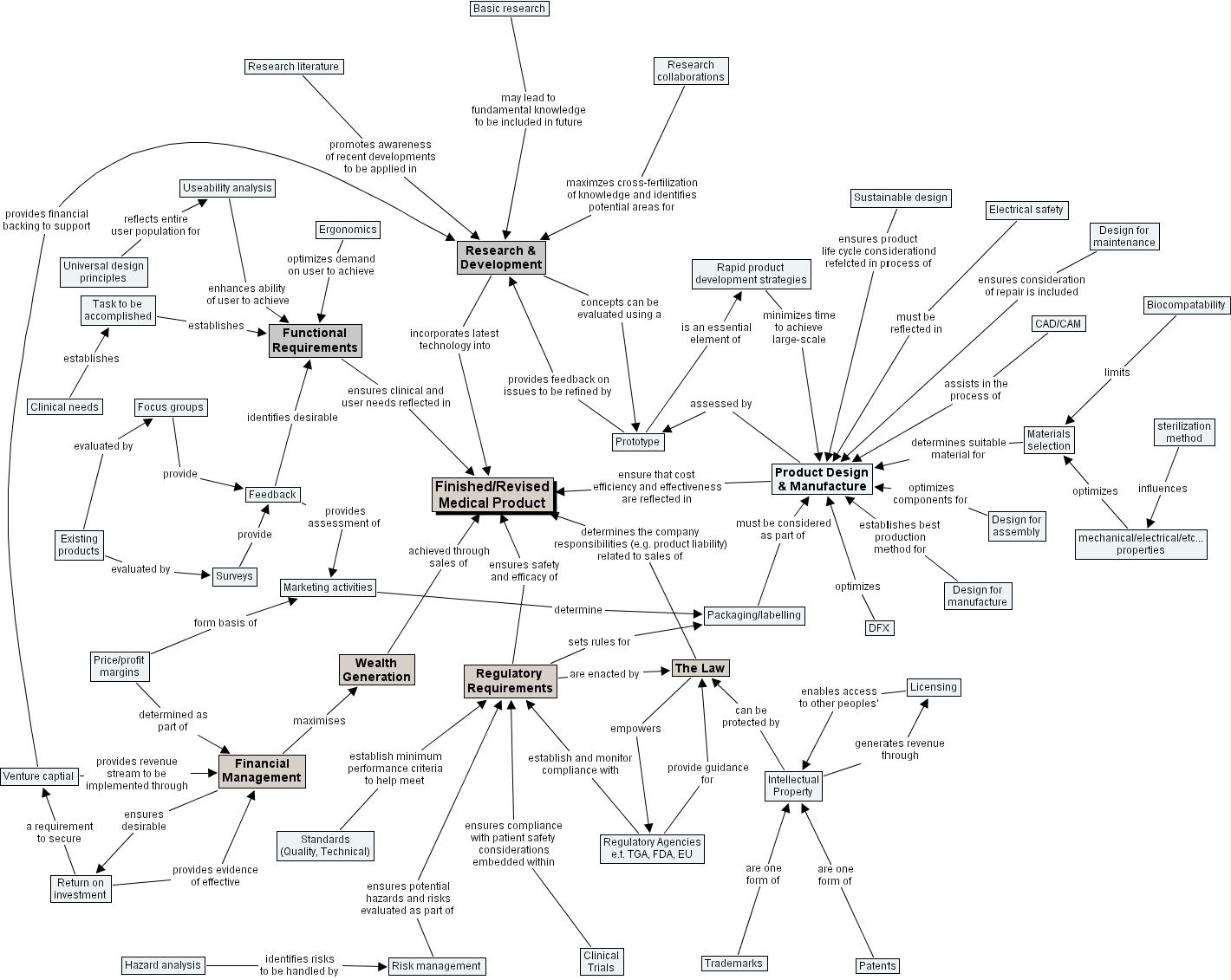 barker t1, design for assembly, financial management, task to be accomplished, cad cam, basic research, design for manufacture, regulatory requirements, rapid product development strategies, clinical needs, existing products, price profit margins, packaging labelling, feedback, return on investment, sterilization method, hazard analysis, risk management, electrical safety, venture captial, biocompatability, the law, functional requirements, product design & manufacture, sustainable design, intellectual property, research & development, ergonomics, research literature, wealth generation, regulatory agencies e.t. tga, fda, eu, focus groups, dfx, clinical trials, prototype, materials selection, finished revised medical product, marketing activities, research collaborations, licensing, mechanical electrical etc... properties, useability analysis, design for maintenance, standards (quality, technical), universal design principles, surveys, trademarks, patents