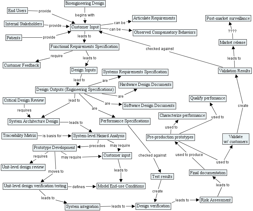 kriewall map2, validation results, design inputs, model end-use conditions, post-market surveillance, hardware design documents, prototype development, traceability matrix, unit-level design verification testing, design outputs (engineering specifications), design verification, customer input, articulate requirements, market release, system-level hazard analysis, functional requirements specification, customer input, pre-production prototypes, test results, validate w customers, observed compensatory behaviors, software design documents, final documentation, risk assessment, critical design review, qualify perfomance, unit-level design review, patients, customer feedback, system architecture design, system integration, systems requirements specification, bioengineering design, end users, characterize performance, performance specifications, internal stakeholders
