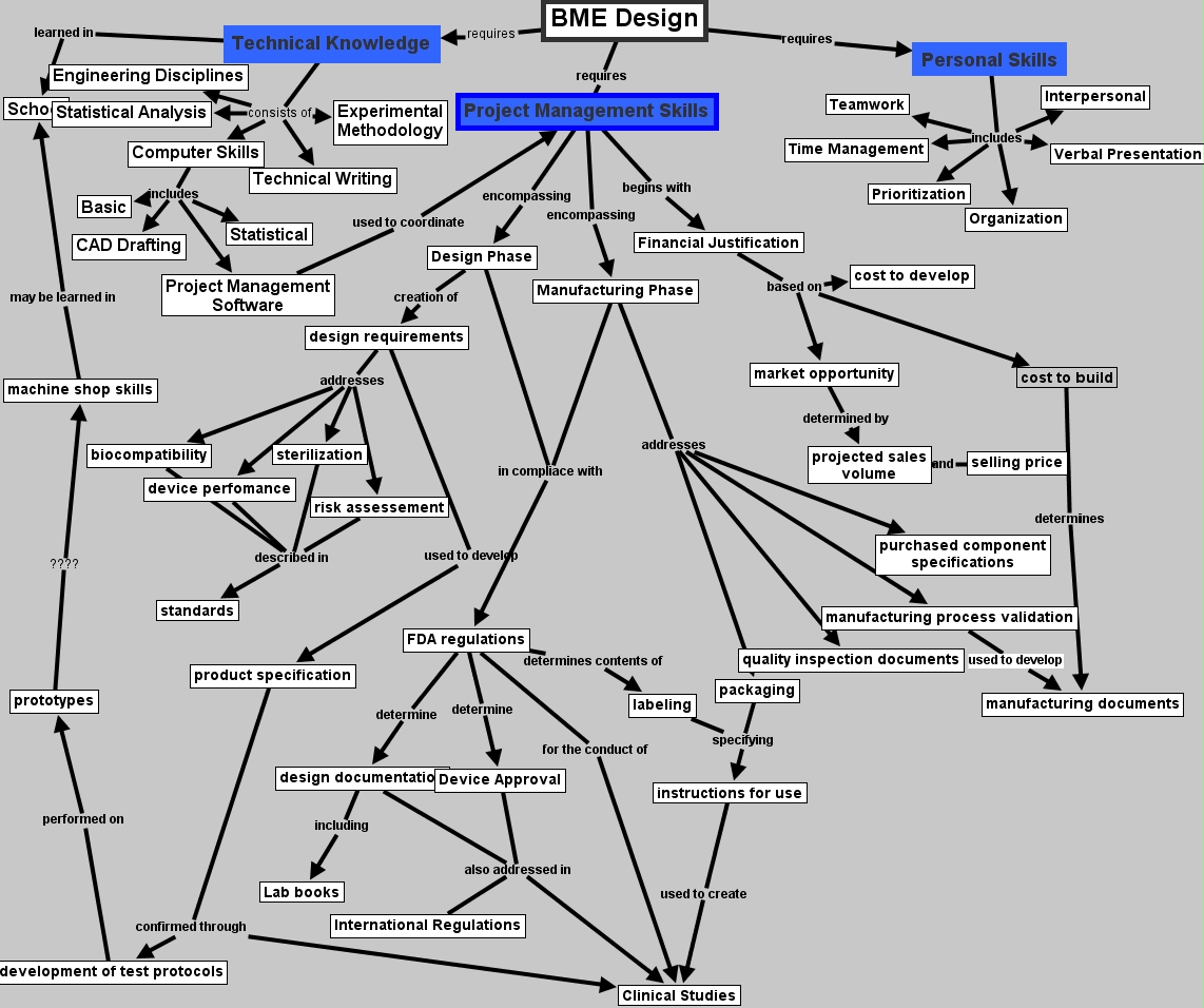 kunst t1, labeling, biocompatibility, teamwork, time management, statistical, sterilization, design phase, prioritization, risk assessement, design requirements, design documentation, development of test protocols, lab books, school, organization, product specification, selling price, device perfomance, fda regulations, market opportunity, device approval, manufacturing phase, machine shop skills, personal skills, international regulations, experimental methodology, verbal presentation, clinical studies, cad drafting, basic, financial justification, manufacturing process validation, manufacturing documents, quality inspection documents, technical knowledge, computer skills, engineering disciplines, cost to build, instructions for use, prototypes, technical writing, purchased component specifications, cost to develop, interpersonal, project management software, bme design, packaging, projected sales volume, project management skills, statistical analysis, standards