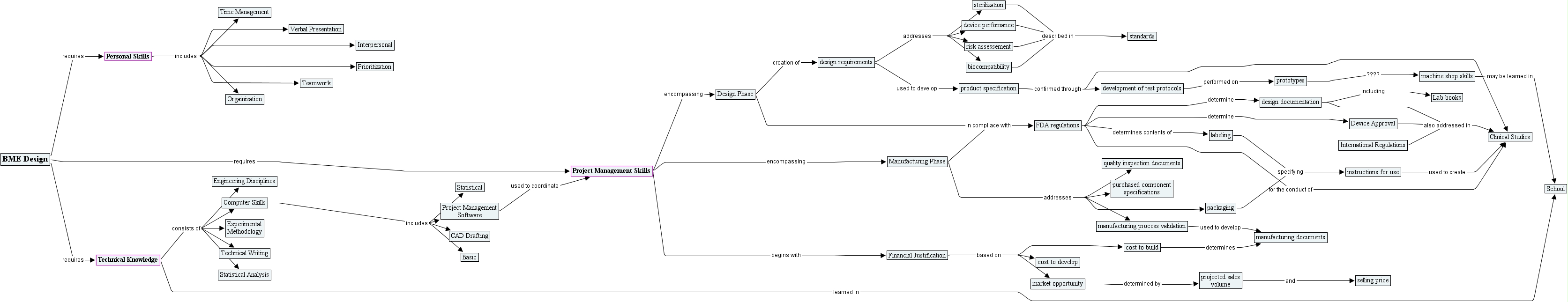 kunst map2 (hierarchical format), packaging, engineering disciplines, school, interpersonal, market opportunity, instructions for use, selling price, quality inspection documents, design requirements, prototypes, design documentation, clinical studies, experimental methodology, manufacturing phase, technical writing, orgainization, machine shop skills, cost to build, verbal presentation, labeling, teamwork, project management software, international regulations, device perfomance, standards, manufacturing documents, basic, product specification, sterilization, design phase, device approval, purchased component specifications, development of test protocols, technical knowledge, cost to develop, prioritization, personal skills, projected sales volume, lab books, manufacturing process validation, financial justification, cad drafting, project management skills, statistical, computer skills, time management, fda regulations, biocompatibility, statistical analysis, risk assessement, bme design