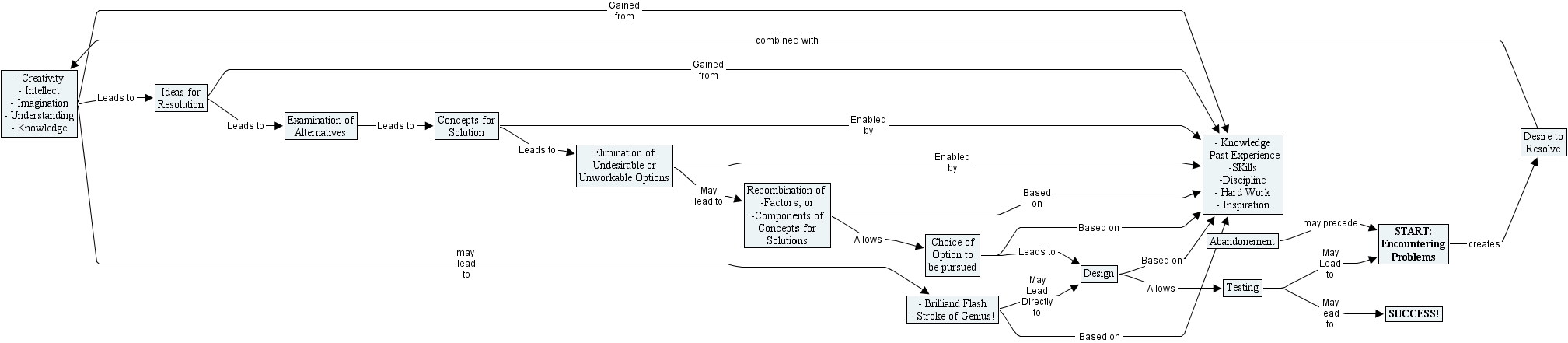 unknown author concept map (slide 13 hierarchical format), success!, abandonement, examination of alternatives, ideas for resolution, concepts for solution, - creativity - intellect - imagination - understanding - knowledge, elimination of undesirable or unworkable options, choice of option to be pursued, recombination of -factors or -components of concepts for solutions, testing, design, - brilliand flash - stroke of genius!, desire to resolve, start encountering problems, - knowledge -past experience -skills -discipline - hard work - inspiration