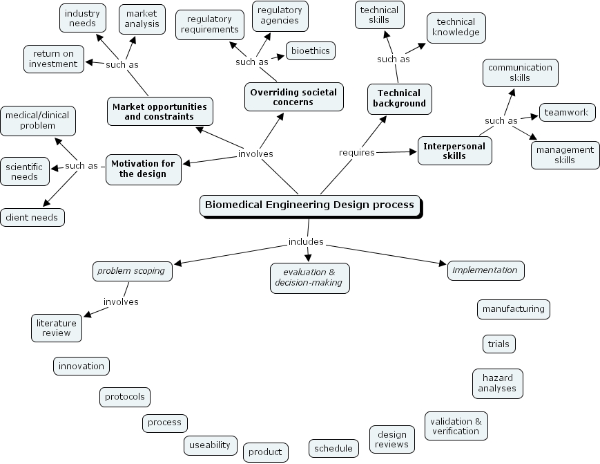 taxonomy web network, validation & verification, technical knowledge, process, protocols, product, schedule, market opportunities and constraints, evaluation & decision-making, scientific needs, motivation for the design, interpersonal skills, client needs, teamwork, implementation, overriding societal concerns, technical skills, problem scoping, manufacturing, bioethics, regulatory agencies, regulatory requirements, industry needs, management skills, useability, technical background, medical clinical problem, design reviews, literature review, innovation, trials, communication skills, hazard analyses, biomedical engineering design process, market analysis, return on investment