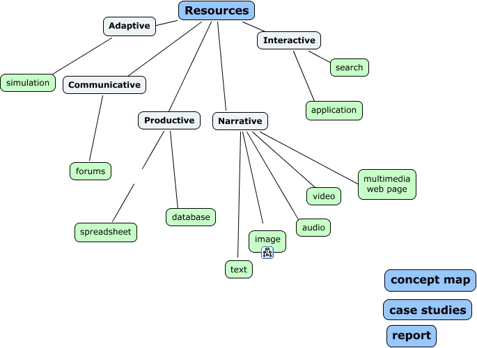 This Concept Map, created with IHMC CmapTools, has information related to: Resources for e-learning, Narrative video, Resources Productive, Interactive application, Narrative multimedia web page, Narrative text, Interactive search, Resources Narrative, Narrative image, Productive spreadsheet, Adaptive simulation, Narrative audio, Resources Adaptive, Communicative forums, Productive database, Resources Interactive, Resources Communicative