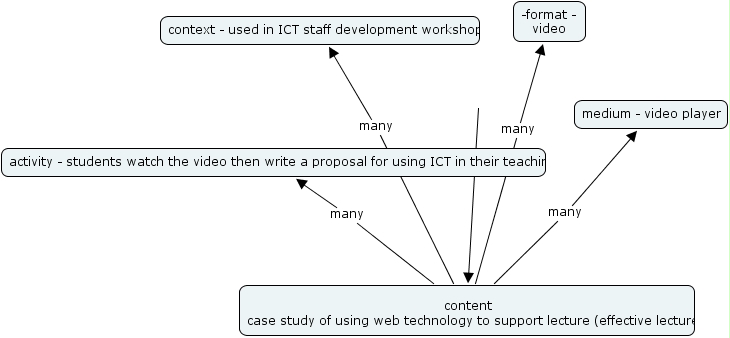 example 1, context - used in ict staff development workshop, content case study of using web technology to support lecture (effective lecture), -format - video, medium - video player, activity - students watch the video then write a proposal for using ict in their teaching