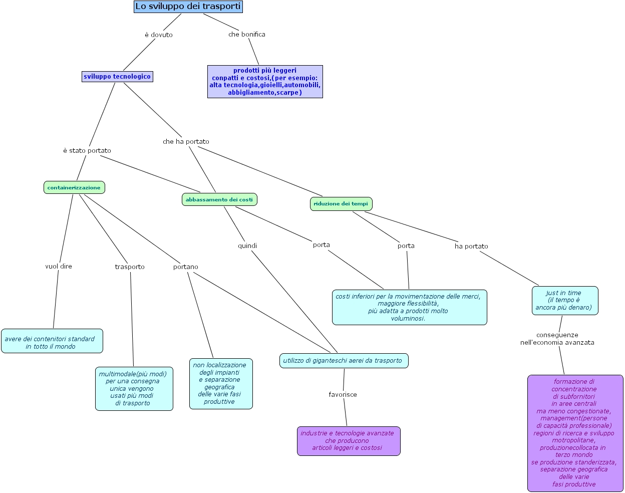 zaniah ferrario, abbassamento dei costi, prodotti pi� leggeri conpatti e costosi,(per esempio alta tecnologia,gioielli,automobili, abbigliamento,scarpe), utilizzo di giganteschi aerei da trasporto, formazione di concentrazione di subfornitori in aree centrali ma meno congestionate, management(persone di capacit� professionale) regioni di ricerca e sviluppo motropolitane, produzionecollocata in terzo mondo se produzione standerizzata, separazione geografica delle varie fasi produttive, just in time (il tempo � ancora pi� denaro), riduzione dei tempi, multimodale(pi� modi) per una consegna unica vengono usati pi� modi di trasporto, avere dei contenitori standard in totto il mondo, non localizzazione degli impianti e separazione geografica delle varie fasi produttive, industrie e tecnologie avanzate che producono articoli leggeri e costosi, sviluppo tecnologico, costi inferiori per la movimentazione delle merci, maggiore flessibilit�, pi� adatta a prodotti molto voluminosi., containerizzazione, lo sviluppo dei trasporti