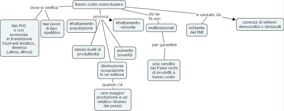 basso costo manodopera, nei pvs o con economie in transizione (sud-est asiatico, america latina, africa), multinazionali, sfruttamento minorile, aumento povert�, una maggior produzione e un relativo ribasso dei prezzi, nei lavori di tipo ripetitivo, richieste del fmi, una vendita nei paesi ricchi di prodotti a basso costo, basso costo manodopera, minimi livelli di produttivit�, diminuzione occupazione in un settore, carenza di sistemi democratici o sindacati, sfruttamento popolazione