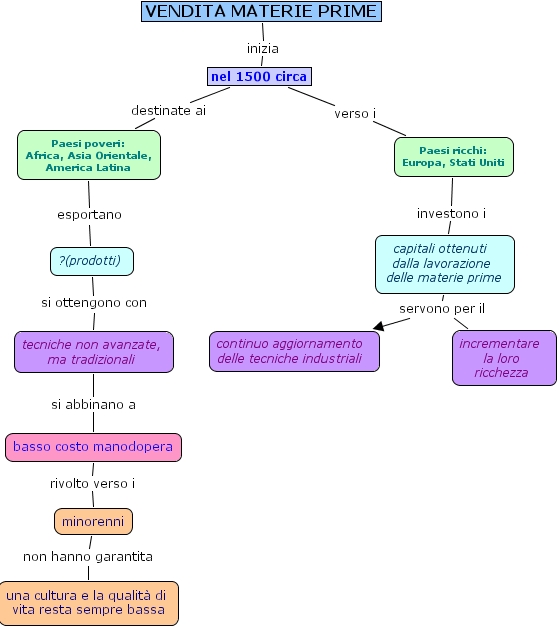 lisa finale, basso costo manodopera, ?(prodotti), tecniche non avanzate, ma tradizionali, paesi poveri africa, asia orientale, america latina, vendita materie prime, incrementare la loro ricchezza, capitali ottenuti dalla lavorazione delle materie prime, nel 1500 circa, paesi ricchi europa, stati uniti, una cultura e la qualit� di vita resta sempre bassa, continuo aggiornamento delle tecniche industriali , minorenni