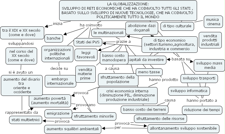 globalizzazione, di tipo economico (settori turismo,agricoltura, industria e commercio, vendita prodotti industriali, embargo internazionale, organizzazioni politiche internazionali, tra il xix e xx secolo (come e dove), sviluppo trasporti, nel corso del xx secolo (come e dove), capitali da investire, sviluppo informatica, basso costo dei terreni, sfruttamento delle risorse, la globalizzazione sviluppo di reti economiche che ha coinvolto tutti gli stati , basato sullo sviluppo di nuove tecnologie, che ha coinvolto politicamente tutto il mondo, aumento povert� (aumento mortalit�), leggi favorevoli, le multinazionali, aumento del divario tra oriente e occidente, sfruttamento minorile, banche, allontanamento sviluppo sostenibile, stati dei pvs, sviluppo mass media, musica cinema, crisi economica interna (diminuzione pil, diminuzione produzione industriale), abolizione dazi doganali, sfruttamento della popolazione, basso costo manodopera, aumento squilibri ambientali, meno tasse, stati multietnici, riduzione dei tempi, emigrazione, di tipo culturale, vendita materie prime
