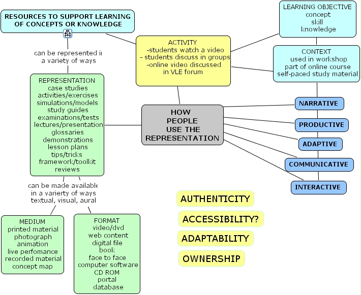 resources breakdown, activity -students watch a video - students discuss in groups -online video discussed in vle forum , authenticity, resources to support learning of concepts or knowledge , context used in workshop part of online course self-paced study material, narrative, adaptability, format video dvd web content digital file book face to face computer software cd rom portal database, medium printed material photograph animation live perfomance recorded material concept map, interactive, representation case studies activities exercises simulations models study guides examinations tests lectures presentation glossaries demonstrations lesson plans tips tricks framework toolkit reviews, how people use the representation, communicative, adaptive, accessibility?, learning objective concept skill knowledge, productive, ownership