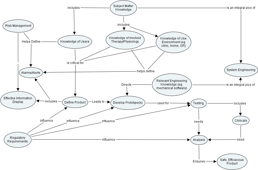 ihlenfeldt concep map, testing, risk management, develop prototype(s), define product, system engineering, relevant engineering knowledge (eg. mechanical software), safe, efficacious product, alarms alerts, knowledge of use environment (eg clinic, home, or), effective information display, knowledge of users, regulatory requirements, knowledge of involved therapy physiology, clinicals, analysis, subject matter knowledge