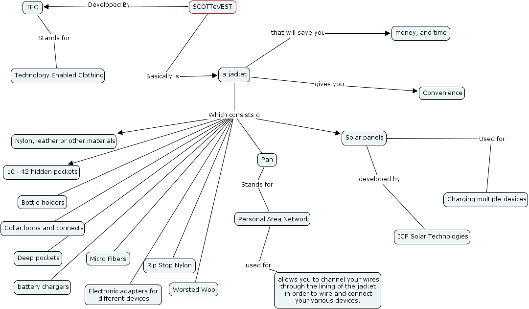 beaucage report4, bottle holders, nylon, leather or other materials, tec, battery chargers, deep pockets, technology enabled clothing, scottevest, charging multiple devices, solar panels, pan, allows you to channel your wires through the lining of the jacket in order to wire and connect your various devices. , collar loops and connects, convenience, micro fibers, electronic adapters for different devices, icp solar technologies, money, and time, worsted wool, personal area network, 10 - 42 hidden pockets, rip stop nylon, a jacket