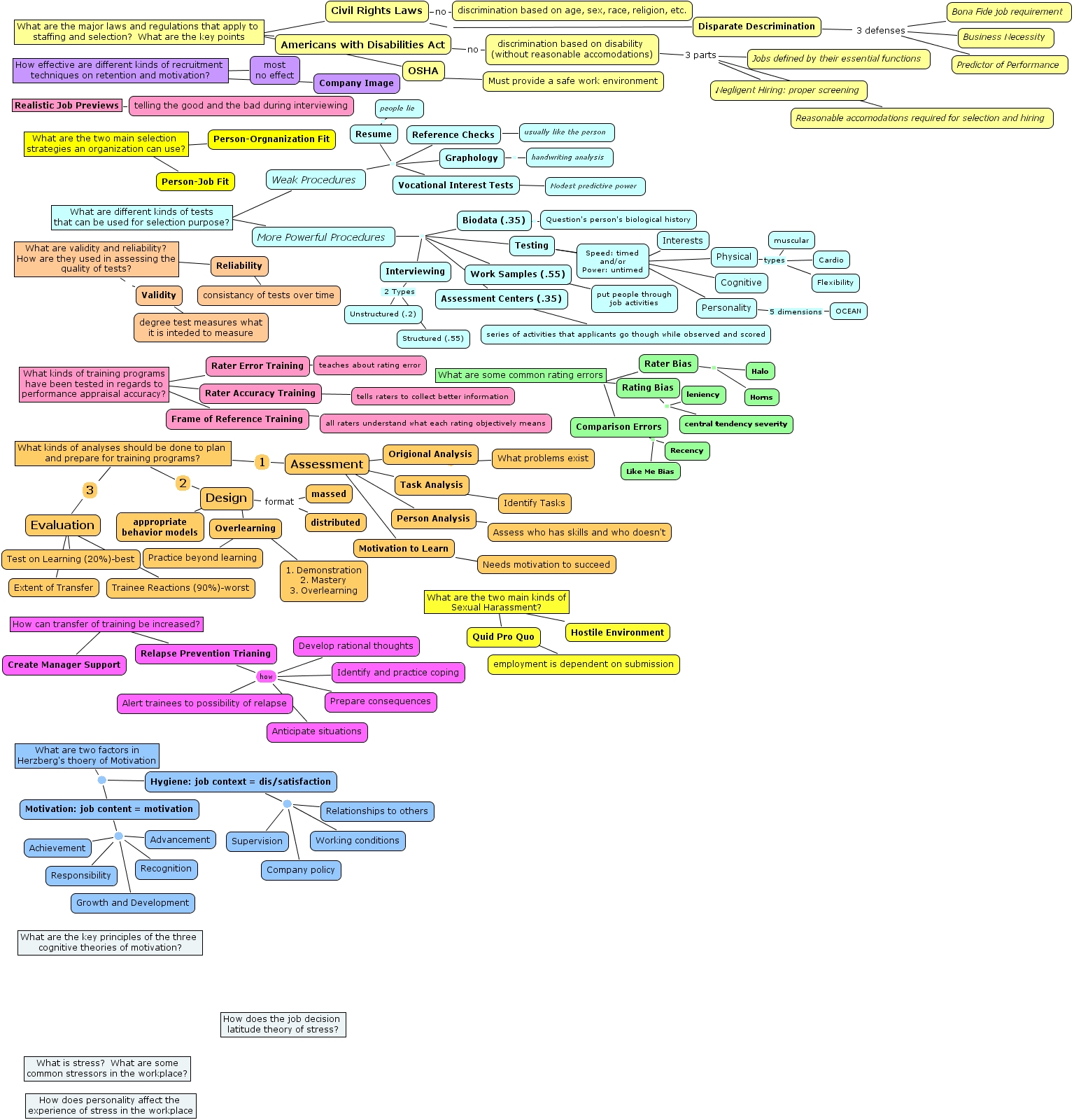 io question, relationships to others, motivation to learn, test on learning (20%)-best, speed timed and or power untimed, rater accuracy training, person-job fit, americans with disabilities act, horns, anticipate situations, what kinds of analyses should be done to plan and prepare for training programs?, structured (.55), responsibility, negligent hiring proper screening, how can transfer of training be increased?, comparison errors, evaluation, graphology, predictor of performance, put people through job activities, testing, rater error training, assessment centers (.35), company image, employment is dependent on submission, design, hostile environment, what kinds of training programs have been tested in regards to performance appraisal accuracy?, what are some common rating errors, tells raters to collect better information, telling the good and the bad during interviewing, overlearning, identify and practice coping, question's person's biological history, vocational interest tests, modest predictive power, what is stress? what are some common stressors in the workplace?, series of activities that applicants go though while observed and scored, achievement, supervision, assess who has skills and who doesn't, company policy, quid pro quo, how effective are different kinds of recruitment techniques on retention and motivation?, discrimination based on age, sex, race, religion, etc., reliability, interviewing, working conditions, degree test measures what it is inteded to measure, discrimination based on disability (without reasonable accomodations), cognitive, person analysis, massed, task analysis, handwriting analysis, appropriate behavior models, muscular, disparate descrimination, central tendency severity, validity, like me bias, reasonable accomodations required for selection and hiring, prepare consequences, growth and development, alert trainees to possibility of relapse, rating bias, what problems exist, cardio, what are validity and reliability? how are they used in assessing the quality of tests?, distributed, civil rights laws, halo, reference checks, business necessity, assessment, relapse prevention trianing, work samples (.55), most no effect, develop rational thoughts, needs motivation to succeed, consistancy of tests over time, leniency, resume, extent of transfer, recognition, osha, physical, practice beyond learning, unstructured (.2), what are the two main kinds of sexual harassment?, jobs defined by their essential functions, trainee reactions (90%)-worst, realistic job previews, advancement, create manager support, all raters understand what each rating objectively means, what are two factors in herzberg's thoery of motivation, flexibility, what are different kinds of tests that can be used for selection purpose?, how does personality affect the experience of stress in the workplace, what are the two main selection strategies an organization can use?, more powerful procedures, usually like the person, recency, what are the key principles of the three cognitive theories of motivation?, how does the job decision latitude theory of stress?, teaches about rating error, interests, what are the major laws and regulations that apply to staffing and selection? what are the key points, biodata (.35), personality, people lie, must provide a safe work environment, ocean, hygiene job context = dis satisfaction, origional analysis, weak procedures, bona fide job requirement, frame of reference training, rater bias, motivation job content = motivation, identify tasks, person-orgnanization fit, 1. demonstration 2. mastery 3. overlearning