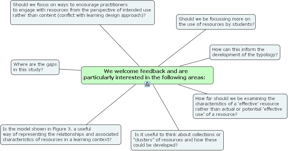 questions, how can this inform the development of the typology?, should we be focussing more on the use of resources by students?, how far should we be examining the characteristics of a �effective� resource rather than actual or potential �effective use� of a resource?, is it useful to think about collections or �clusters� of resources and how these could be developed?, should we focus on ways to encourage practitioners to engage with resources from the perspective of intended use rather than content (conflict with learning design approach)? , we welcome feedback and are particularly interested in the following areas , where are the gaps in this study?, is the model shown in figure 3. a useful way of representing the relationships and associated characteristics of resources in a learning context?