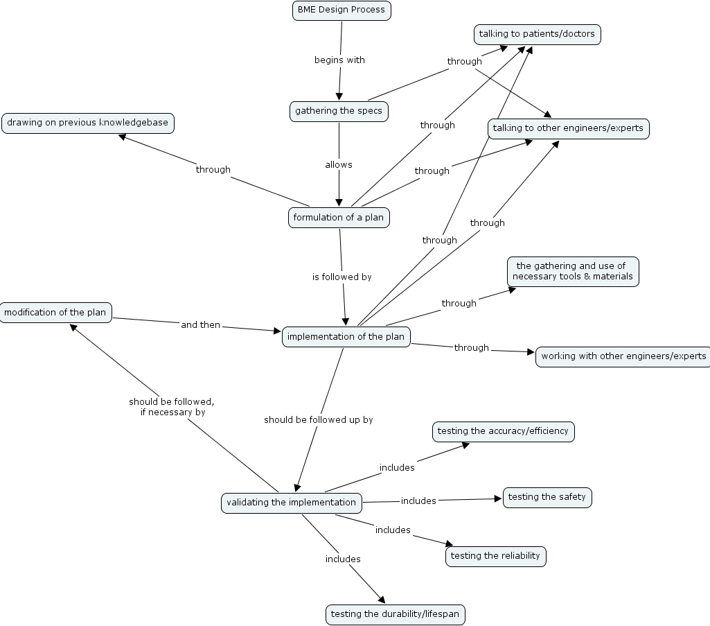 clements 1, bme design process, talking to patients doctors, testing the reliability, testing the durability lifespan, validating the implementation, testing the accuracy efficiency, implementation of the plan, modification of the plan, talking to other engineers experts, gathering the specs, testing the safety, the gathering and use of necessary tools & materials, working with other engineers experts, drawing on previous knowledgebase, formulation of a plan