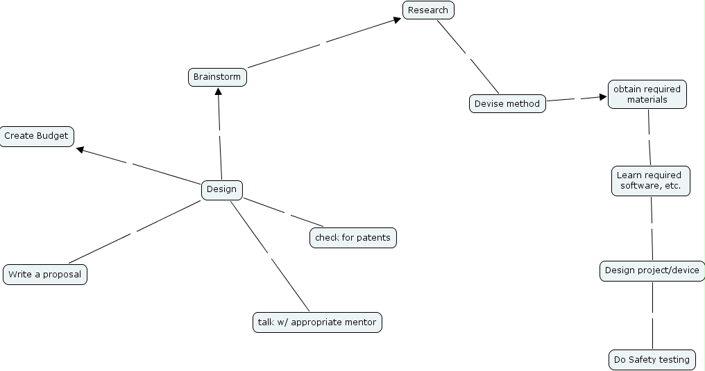 shah 2, design, brainstorm, design project device, create budget, talk w appropriate mentor, write a proposal, do safety testing, devise method, check for patents, obtain required materials, research, learn required software, etc.