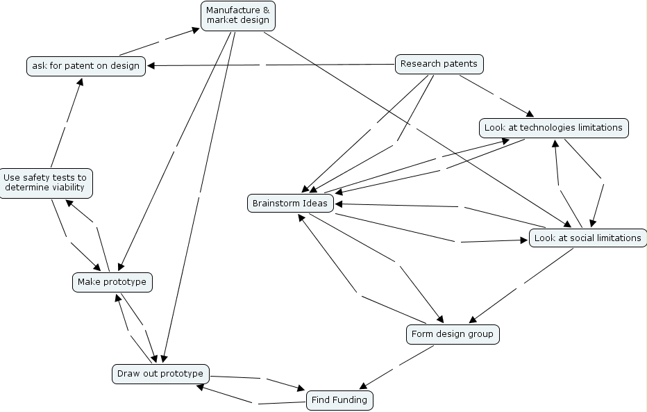 yan 2, draw out prototype, look at technologies limitations, look at social limitations, ask for patent on design, manufacture & market design, use safety tests to determine viability, brainstorm ideas, research patents, find funding, make prototype, form design group