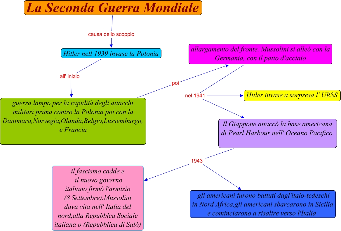 Questa Cmap, creata con IHMC CmapTools, contiene informazioni relative a: 2 g m (luca Ma Virginia), La Seconda Guerra Mondiale causa dello scoppio Hitler nell 1939 invase la Polonia, guerra lampo per la rapidità degli attacchi militari prima contro la Polonia poi con la Danimara,Norvegia,Olanda,Belgio,Lussemburgo, e Francia poi allargamento del fronte. Mussolini si alleò con la Germania, con il patto d'acciaio, Il Giappone attaccò la base americana di Pearl Harbour nell' Oceano Pacifico 1943 gli americani furono battuti dagl'italo-tedeschi in Nord Africa,gli americani sbarcarono in Sicilia e cominciarono a risalire verso l'Italia, Hitler nell 1939 invase la Polonia all' inizio guerra lampo per la rapidità degli attacchi militari prima contro la Polonia poi con la Danimara,Norvegia,Olanda,Belgio,Lussemburgo, e Francia, allargamento del fronte. Mussolini si alleò con la Germania, con il patto d'acciaio nel 1941 Hitler invase a sorpresa l' URSS, Il Giappone attaccò la base americana di Pearl Harbour nell' Oceano Pacifico 1943 il fascismo cadde e il nuovo governo italiano firmò l'armizio (8 Settembre).Mussolini dava vita nell' Italia del nord,alla Repubblca Sociale italiana o (Repubblica di Salò), allargamento del fronte. Mussolini si alleò con la Germania, con il patto d'acciaio nel 1941 Il Giappone attaccò la base americana di Pearl Harbour nell' Oceano Pacifico