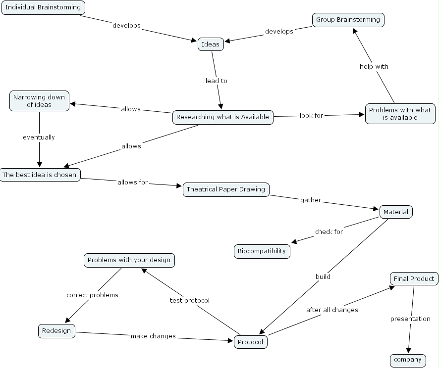 cmap 31, final product, redesign, the best idea is chosen, material, researching what is available, company, theatrical paper drawing, biocompatibility, narrowing down of ideas, problems with your design, problems with what is available, protocol, group brainstorming, individual brainstorming, ideas