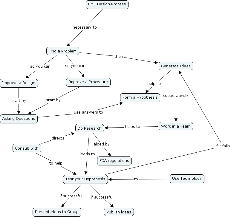 cmap 90, form a hypothesis, find a problem, publish ideas, do research, generate ideas, test your hypothesis, work in a team, asking questions, improve a design, fda regulations, bme design process, use technology, consult with, present ideas to group, improve a procedure