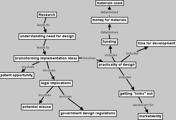 cmap 1, materials used, brainstorming implementation ideas, potential misuse, understanding need for design, getting kinks out, funding, money for materials, government design regulations, patent opportunity, research, practicality of design, legal implications, marketability, time for development