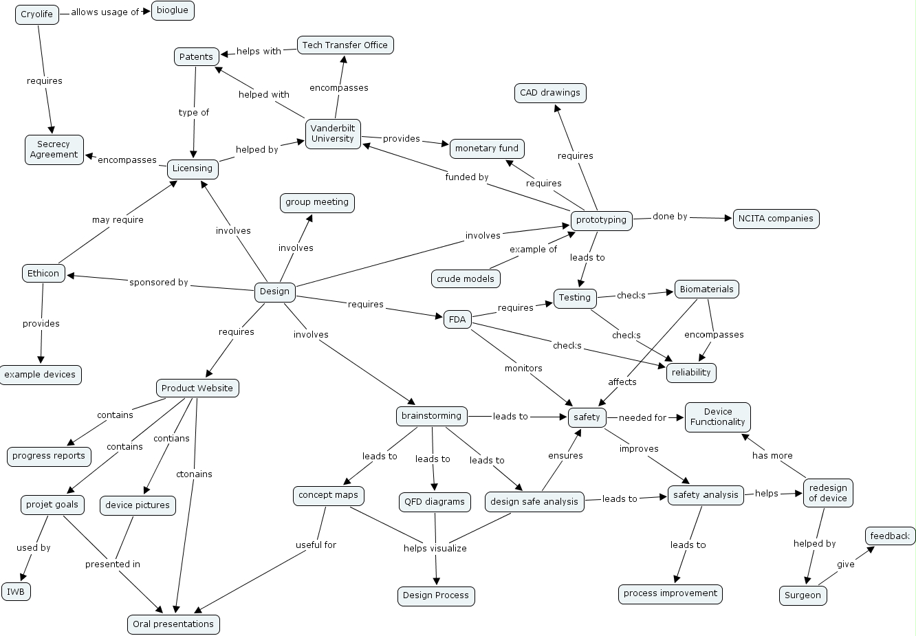 cmap 6 , device functionality, testing, safety analysis, safety, reliability, design safe analysis, tech transfer office, crude models, ethicon, surgeon, cad drawings, concept maps, design process, secrecy agreement, feedback, ncita companies, vanderbilt university, process improvement, product website, licensing, group meeting, brainstorming, device pictures, biomaterials, redesign of device, example devices, projet goals, monetary fund, oral presentations, fda, iwb, qfd diagrams, bioglue, patents, prototyping, cryolife, progress reports, design