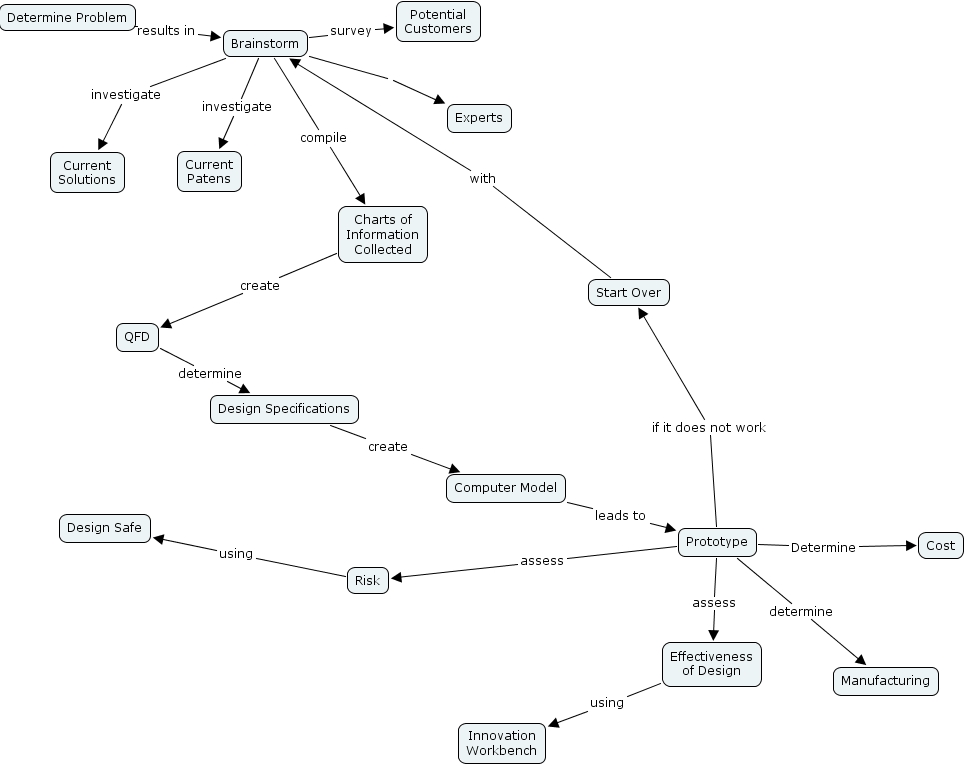 cmap 9 , computer model, risk, qfd, current patens, design safe, charts of information collected, cost, manufacturing, brainstorm, start over, effectiveness of design, innovation workbench, determine problem, prototype, design specifications, potential customers, current solutions, experts