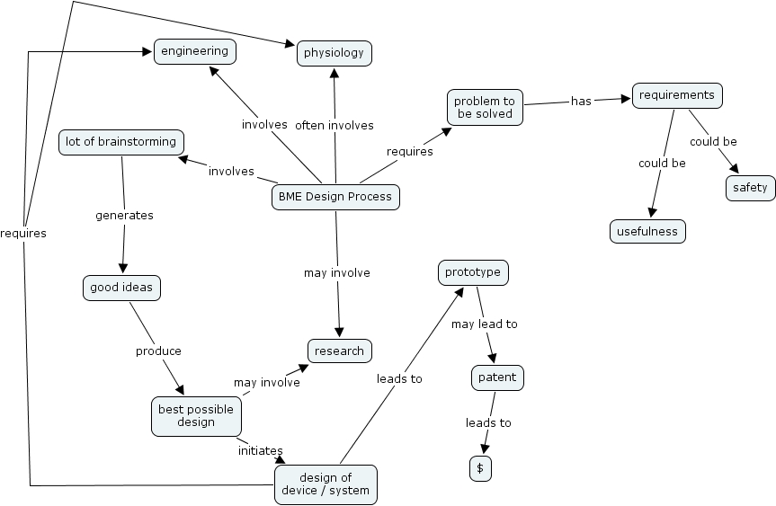 cmap 10 , bme design process, safety, requirements, design of device system, best possible design, patent, prototype, lot of brainstorming, research, physiology, problem to be solved, usefulness, $, engineering, good ideas