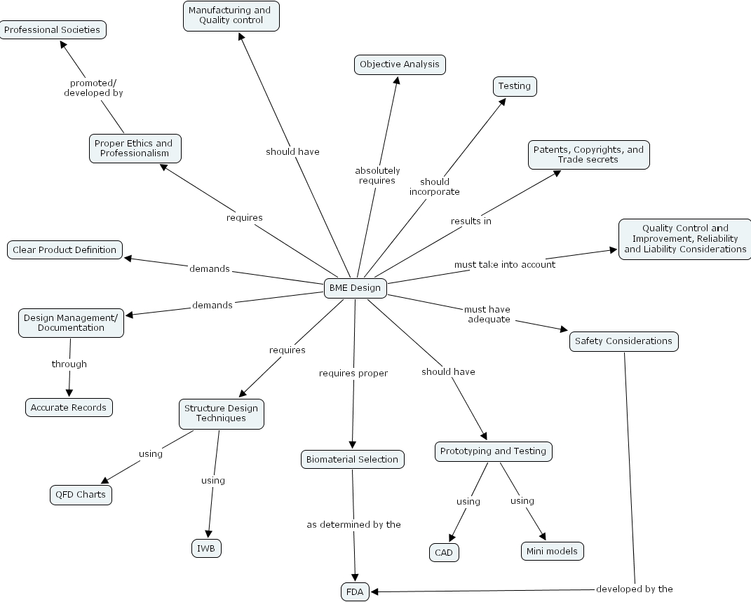 cmap 35, safety considerations, professional societies, iwb, proper ethics and professionalism, patents, copyrights, and trade secrets, accurate records, mini models, quality control and improvement, reliability and liability considerations, objective analysis, manufacturing and quality control, cad, structure design techniques, testing, design management documentation, biomaterial selection, bme design, prototyping and testing, qfd charts, fda, clear product definition
