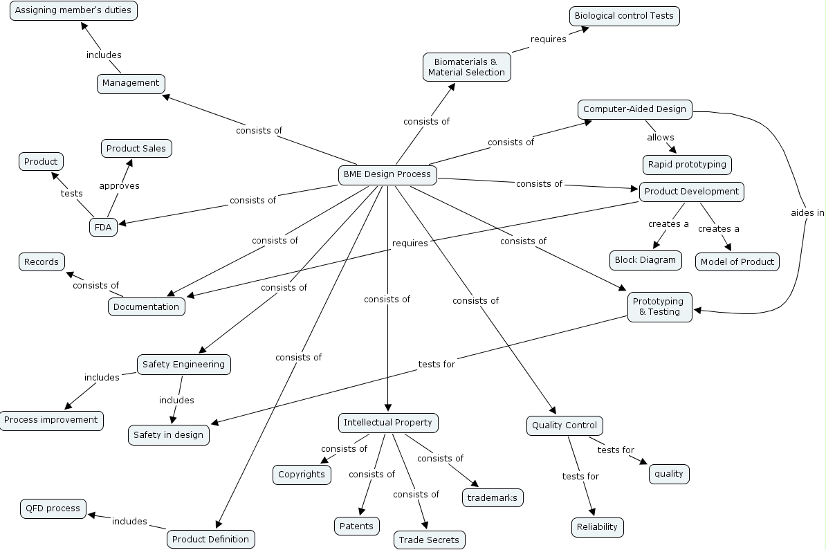 cmap 41, fda, rapid prototyping, patents, documentation, biomaterials & material selection, trade secrets, quality control, trademarks, model of product, safety in design, product definition, prototyping & testing, block diagram, process improvement, intellectual property, biological control tests, product development, bme design process, computer-aided design, copyrights, reliability, management, assigning member's duties, product, quality, safety engineering, qfd process, product sales, records