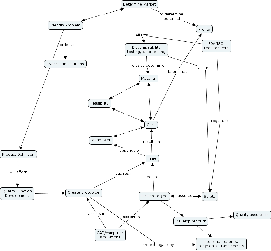 cmap 51, licensing, patents, copyrights, trade secrets, quality assurance, fda iso requirements, determine market, cad computer simulations, create prototype, manpower, identify problem, develop product, test prototype, product definition, safety, time, profits, quality function development, brainstorm solutions, cost, biocompatibility testing other testing, feasibility, material