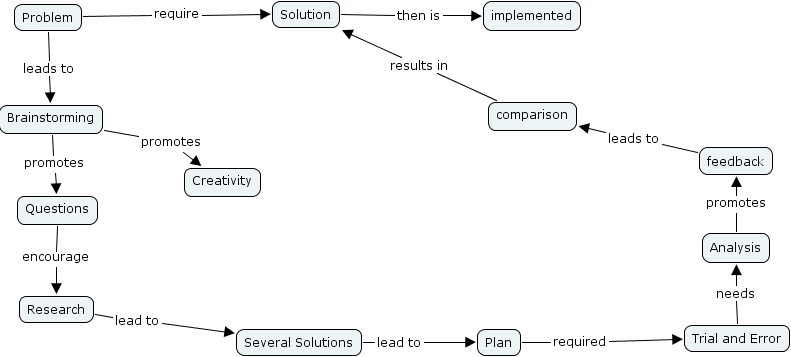 cmap 52, brainstorming, feedback, comparison, solution, analysis, questions, creativity, several solutions, trial and error, problem, implemented, plan, research