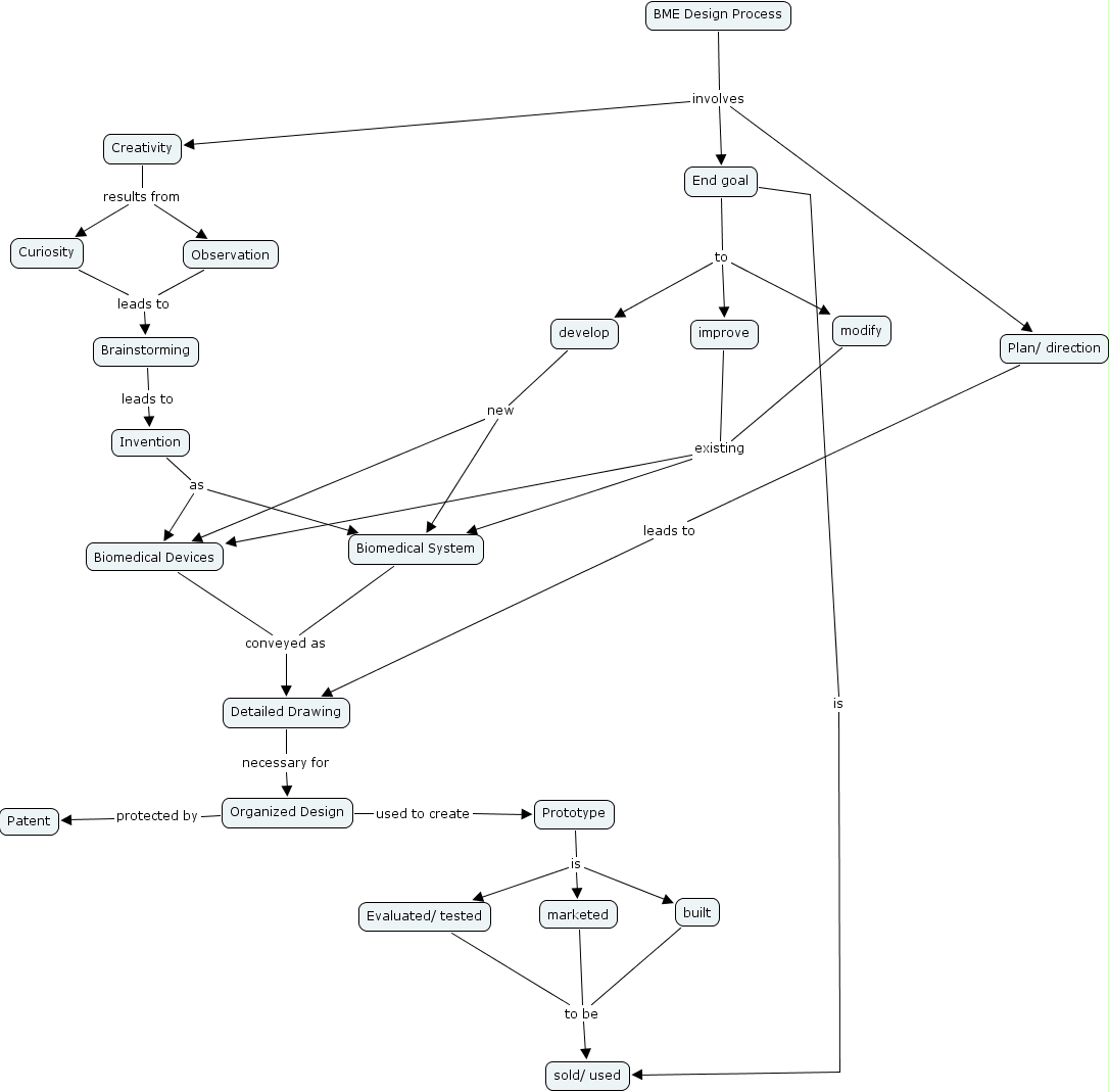 cmap 61, biomedical devices, plan direction, prototype, improve, built, organized design, evaluated tested, patent, detailed drawing, invention, develop, bme design process, end goal, marketed, curiosity, biomedical system, creativity, sold used, modify, brainstorming, observation