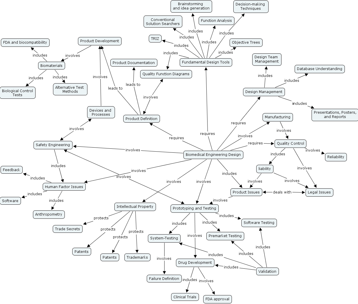 cmap 62, trademarks, trade secrets, safety engineering, manufacturing, anthropometry, biomedical engineering design, quality control, patents, human factor issues, product documentation, patents, fda approval, triz, intellectual property, biological control tests, product development, drug development, failure definition, biomaterials, fundamental design tools, database understanding, devices and processes, design management, premarket testing, brainstorming and idea generation, legal issues, product issues, quality function diagrams, objective trees, decision-making techniques, conventional solution searchers, design team management, validation, fda and biocompatibility, software testing, reliability, feedback, system-testing, software, function analysis, presentations, posters, and reports, liability, clinical trials, product definition, prototyping and testing, alternative test methods