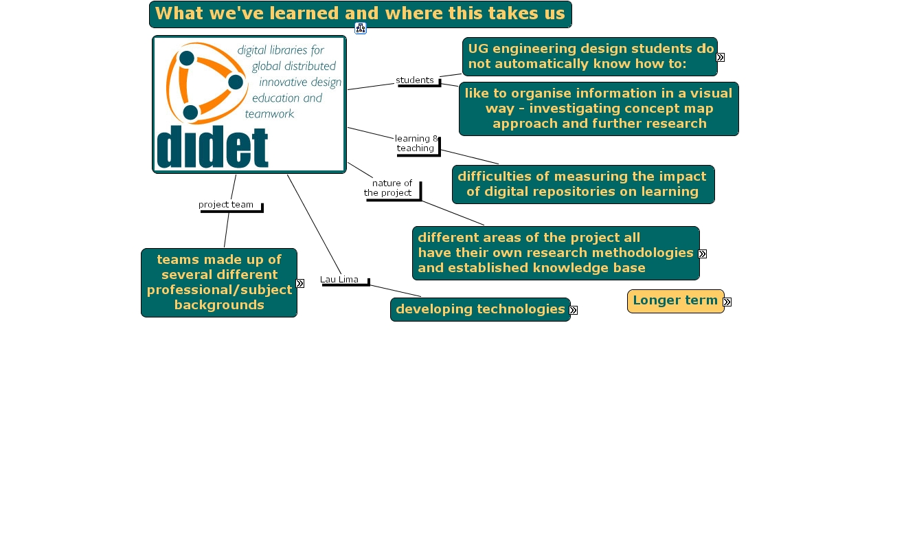 1. didet project learned, impact on design process, sustainability, ug engineering design students do not automatically know how to , different perceptions of others roles and backgrounds different areas of project, different languages, impact on student behaviour, longer term, integration with web ct, global teamwork research, ug engineering design students do not automatically know how to, like to organise information in a visual way - investigating concept map approach and further research, different areas of the project all have their own research methodologies and established knowledge base, differences, use of information, evaluating smaller elements of the project, critcally evaluate materials, difficulties of measuring the impact of digital repositories on learning, varied levels of engagement design education learning & teaching approaches information and it literacy tools and technologies, managing storing information, embed and integrate information literacy, dissemination, , identify the most appropriate sources of information (digital non-digital), apply metadata, ensure developments comply with standards to ensure compatibility and portability, develop ways for students to store and locate information in a visual way, manage organise information, effectively retrieve information, effectiveness of learning environment, ????, what we've learned and where this takes us, identify appropriate mechanisms to apply metadata to content, developments led by design education needs not technology led, teams made up of several different professional subject backgrounds, developing technologies, usefulness of digital repository, impact on student learning