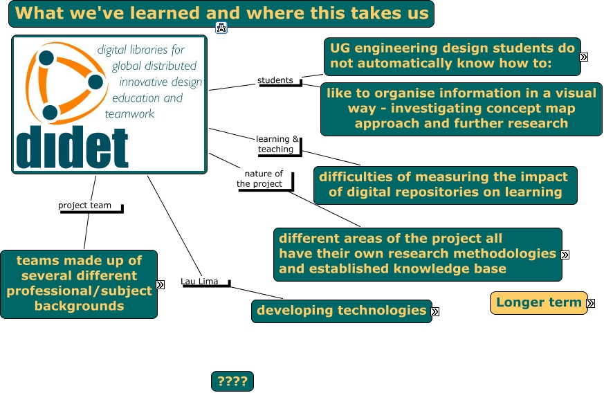 1. Didet Project learned, developing technologies Lau Lima , different areas of the project all have their own research methodologies and established knowledge base nature of the project , difficulties of measuring the impact of digital repositories on learning learning & teaching , UG engineering design students do not automatically know how to: students , like to organise information in a visual way - investigating concept map approach and further research students , teams made up of several different professional/subject backgrounds project team