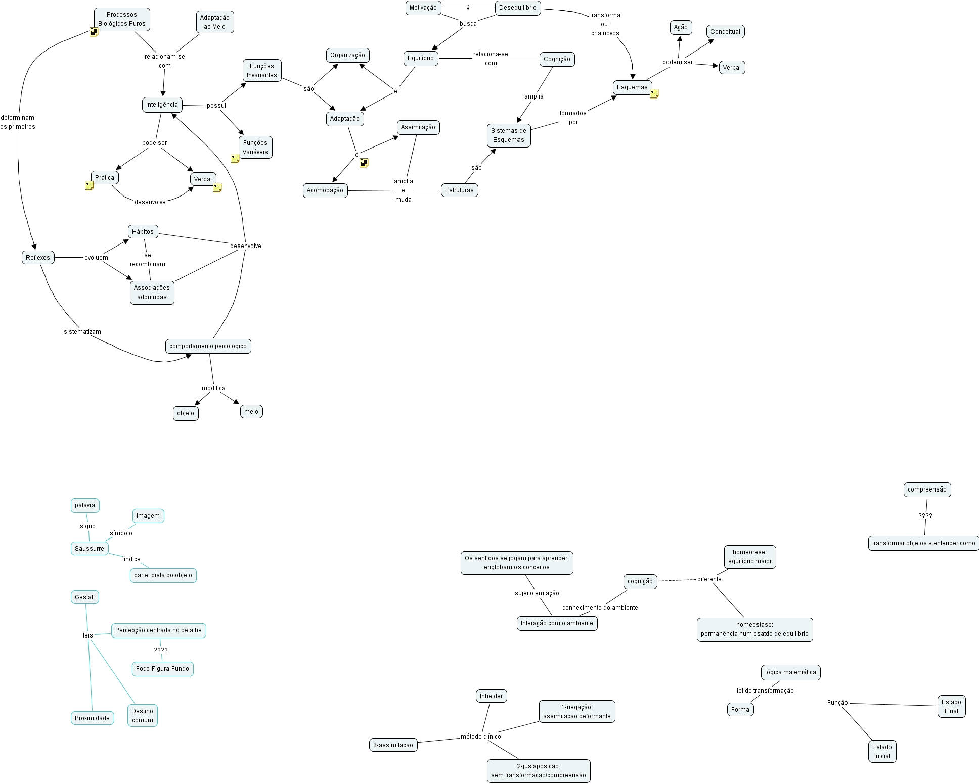 danih1, cogni��o, saussurre, intelig�ncia, estado inicial, desequil�brio, adapta��o, gestalt, 1-nega��o assimilacao deformante, cogni��o, os sentidos se jogam para aprender, englobam os conceitos, pr�tica, objeto, intera��o com o ambiente, palavra, equil�brio, 2-justaposicao sem transformacao compreensao, verbal, parte, pista do objeto, fun��es invariantes, sistemas de esquemas, fun��es vari�veis, reflexos, imagem, proximidade, motiva��o, meio, homeostase perman�ncia num esatdo de equil�brio, compreens�o, destino comum, forma, foco-figura-fundo, homeorese equil�brio maior, conceitual, comportamento psicologico, a��o, 3-assimilacao, percep��o centrada no detalhe, transformar objetos e entender como, l�gica matem�tica, esquemas, estado final, estruturas, inhelder, h�bitos, adapta��o ao meio, verbal, acomoda��o, organiza��o, associa��es adquiridas, processos biol�gicos puros, assimila��o