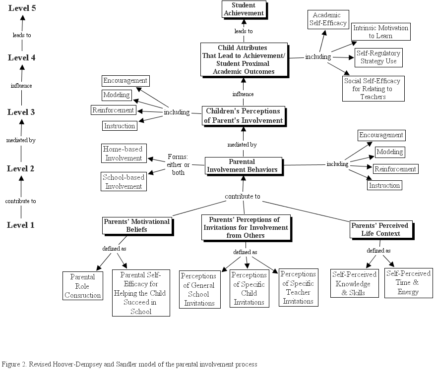 hds model august 2004 map for technical report, parental involvement behaviors , parental role consruction, level 4, student achievement, home-based involvement, self-regulatory strategy use, level 5, level 1, encouragement, academic self-efficacy, perceptions of specific teacher invitations, encouragement, figure 2. revised hoover-dempsey and sandler model of the parental involvement process, school-based involvement, parental self- efficacy for helping the child succeed in school, intrinsic motivation to learn, modeling, self-perceived knowledge & skills , parents' motivational beliefs, level 3, instruction, reinforcement, perceptions of general school invitations, self-perceived time & energy, social self-efficacy for relating to teachers, modeling, parents' perceptions of invitations for involvement from others, reinforcement, parents' perceived life context, level 2, instruction, perceptions of specific child invitations, children's perceptions of parent's involvement, child attributes that lead to achievement student proximal academic outcomes