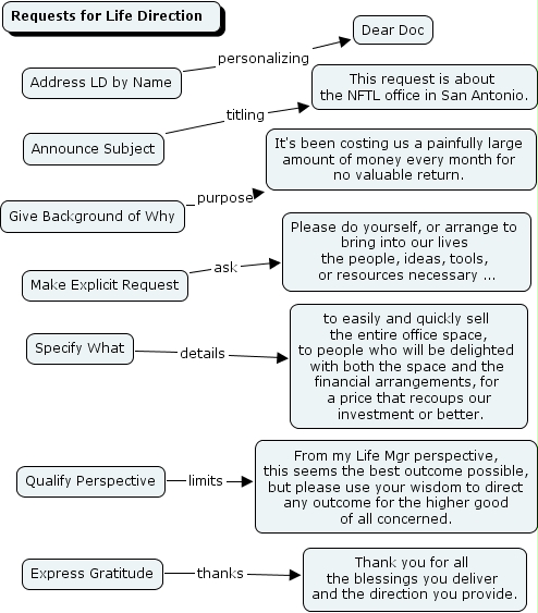 requests for life direction - template, express gratitude, specify what, make explicit request, give background of why, announce subject, qualify perspective, address ld by name, requests for life direction , it's been costing us a painfully large amount of money every month for no valuable return. , this request is about the nftl office in san antonio., please do yourself, or arrange to bring into our lives the people, ideas, tools, or resources necessary ..., from my life mgr perspective, this seems the best outcome possible, but please use your wisdom to direct any outcome for the higher good of all concerned., thank you for all the blessings you deliver and the direction you provide., dear doc, to easily and quickly sell the entire office space, to people who will be delighted with both the space and the financial arrangements, for a price that recoups our investment or better.
