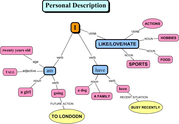 Questa Cmap, creata con IHMC CmapTools, contiene informazioni relative a: Personal Description2, I VERB LIKE/LOVE/HATE, I verb am, am age twenty years old, am verb going, am noun a girl, I verb have, LIKE/LOVE/HATE NOUN FOOD, LIKE/LOVE/HATE NOUN HOBBIES, am adjective TALL, have verb been, have noun a dog, have noun A FAMILY, been RECENT SITUATION BUSY RECENTLY, LIKE/LOVE/HATE VERB ACTIONS, going FUTURE ACTION TO LONDODN, LIKE/LOVE/HATE NOUN SPORTS
