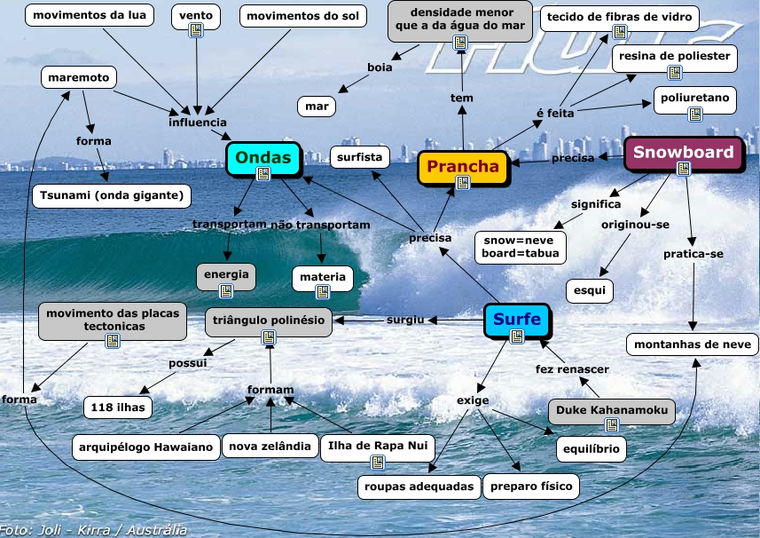 Esse mapa conceitual, produzido no IHMC CmapTools, tem a informação relacionada a: O Surfe e suas relações, Prancha é feita tecido de fibras de vidro, Prancha é feita poliuretano, Prancha é feita resina de poliester, Ilha de Rapa Nui formam triângulo polinésio, Snowboard precisa Prancha, Surfe exige equilíbrio, Snowboard significa snow=neve board=tabua, triângulo polinésio possui 118 ilhas, Surfe exige roupas adequadas, nova zelândia formam triângulo polinésio, Snowboard pratica-se montanhas de neve, Snowboard originou-se esqui, maremoto influencia Ondas, Surfe precisa Ondas, Duke Kahanamoku fez renascer Surfe, movimentos da lua influencia Ondas, Ondas transportam energia, Surfe precisa Prancha, arquipélogo Hawaiano formam triângulo polinésio, Surfe exige preparo físico