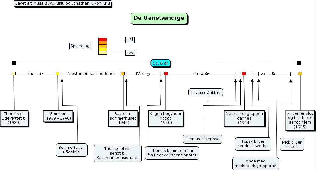 musa b�y�kuslu, de uanst�ndige, tid, , lavet af musa b�y�kuslu og jonathan niyonkuru, , , modstandsgruppen dannes (1944), , , , sommer (1939 - 1940), topsy bliver sendt til sverige, thomas drikker, de uanst�ndige, , thomas bliver sendt til regnvejrspensionatet, , , , thomas kommer hjem fra regnvejrspensionatet, , thomas er lige flyttet til (1939), m�de med modstandsgrupperne, , busted i sommerhuset (1940), mick bliver skudt, h�j, krigen er slut og folk bliver sendt hjem (1945), , , , , , , , krigen begynder rigtigt (1940), sp�nding, , lav, , sommerferie i r�geleje, thomas bliver syg