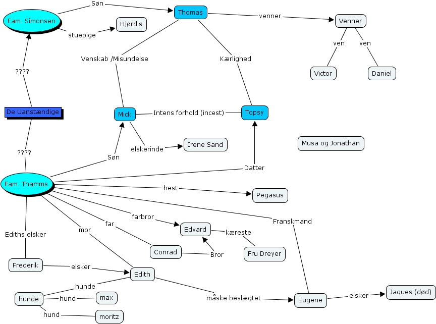 musa og jonathan de uanst�ndige, personer, daniel, jaques (d�d), irene sand, pegasus, musa og jonathan, edith, de uanst�ndige, topsy, fam. thamms, fam. simonsen, eugene, hunde, mick, conrad, max, moritz, frederik, hj�rdis, thomas, venner, fru dreyer, victor, edvard