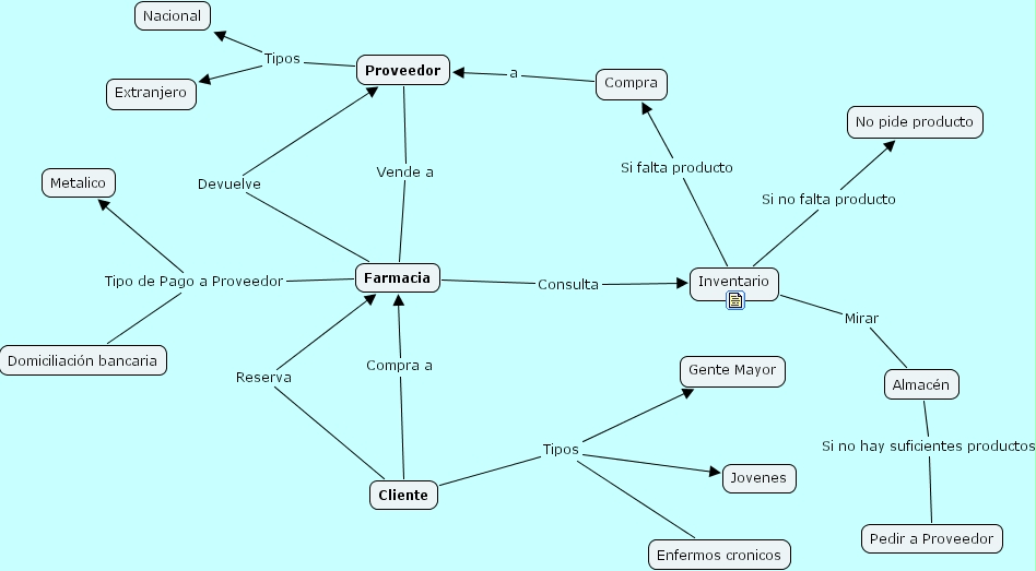 Proveedor Tipos Nacional, Proveedor Tipos Extranjero, Compra a Proveedor, Almac�n Si no hay suficientes productos Pedir a Proveedor, Farmacia Tipo de Pago a Proveedor Domiciliaci�n bancaria, Farmacia Tipo de Pago a Proveedor Metalico, Farmacia Consulta Inventario, Farmacia Devuelve Proveedor, Cliente Compra a Farmacia, Inventario Si falta producto Compra, Inventario Mirar Almac�n, Cliente Tipos Enfermos cronicos, Cliente Tipos Gente Mayor, Cliente Tipos Jovenes, Cliente Reserva Farmacia, Proveedor Vende a Farmacia, Inventario Si no falta producto No pide producto