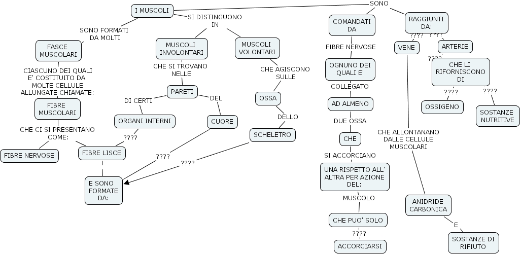 muscoli, fibre muscolari, vene, ognuno dei quali e', arterie, muscoli involontari, e sono formate da , ossa, ad almeno, che puo' solo, anidride carbonica, che li riforniscono di, fibre lisce, scheletro, che, sostanze nutritive, comandati da, accorciarsi, una rispetto all' altra per azione del , fibre nervose, i muscoli, sostanze di rifiuto, pareti, ossigeno, organi interni, fasce muscolari, cuore, muscoli volontari, raggiunti da