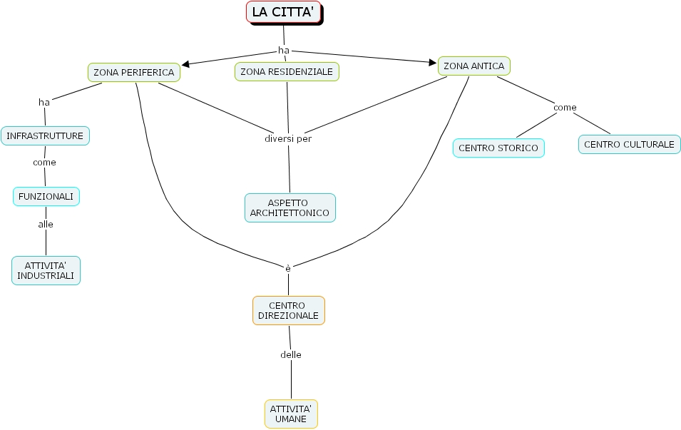 ZONA PERIFERICA � CENTRO DIREZIONALE, CENTRO DIREZIONALE delle ATTIVITA' UMANE, FUNZIONALI alle ATTIVITA' INDUSTRIALI, INFRASTRUTTURE come FUNZIONALI, ZONA PERIFERICA diversi per ASPETTO ARCHITETTONICO, ZONA PERIFERICA ha INFRASTRUTTURE, ZONA ANTICA come CENTRO STORICO, ZONA ANTICA come CENTRO CULTURALE, ZONA ANTICA diversi per ASPETTO ARCHITETTONICO, ZONA RESIDENZIALE diversi per ASPETTO ARCHITETTONICO, ZONA ANTICA � CENTRO DIREZIONALE, LA CITTA' ha ZONA ANTICA, LA CITTA' ha ZONA PERIFERICA, LA CITTA' ha ZONA RESIDENZIALE
