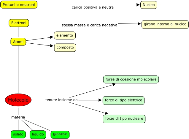 This Concept Map, created with IHMC CmapTools, has information related to: giuli borrelli, Protoni e neutroni carica positiva e neutra Nucleo, Elettroni ???? Atomi, Protoni e neutroni ???? Elettroni, Molecole materia liquido, Molecole tenute insieme da forze di coesione molecolare, Atomi ???? Molecole, Atomi ???? elemento, Molecole materia gassoso, Molecole tenute insieme da forze di tipo nucleare, Molecole tenute insieme da forze di tipo elettrico, Molecole materia solido, Elettroni stessa massa e carica negativa girano intorno al nucleo, Atomi ???? composto
